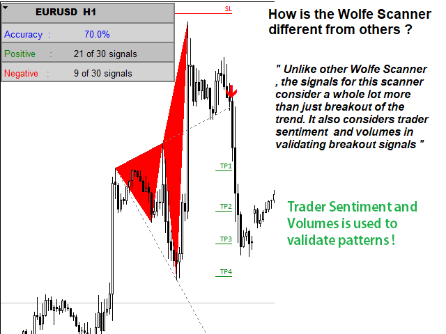 - The product scans Wolfe wave patterns on any time frame and currency pair.